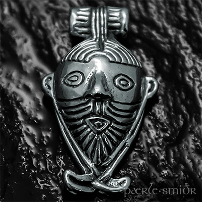 Replik eines Anhängers vom Typ Gile in der Form eines Männerkopfes mit geflochtenem Vollbart. Charakteristisch ist hier die einfache, realistische Darstellung des Kopfes. In Originalgröße und aus massivem Silber hergestellt.
