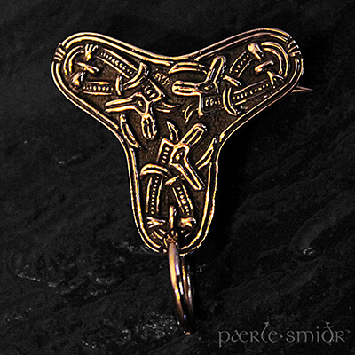 Kleine, kleeblattförmige Fibel, die nach einem Originalfund aus Grab 882 in Birka (Schweden) gefertigt ist. Die im Jelling-Stil mit drei ineinander verschlungenen Tierkörpern verzierte Fibel entspricht in ihrer Größe dem Original und ist mit einem Ring zum Befestigen einer Kette versehen.
