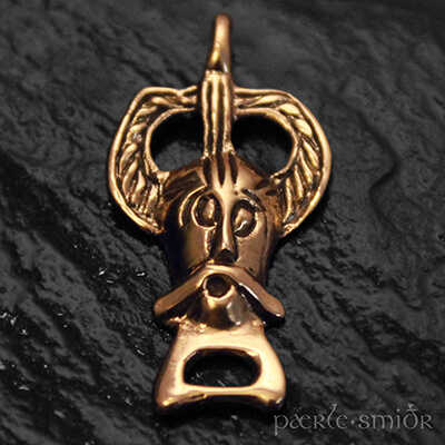 Der in Ribe / Dänemark gefundene Anhänger ist aus Blei, was selbst für die damalige Zeit ein ungewöhnliches Material für Schmuck ist. Möglicherweise handelt es sich nur um ein Modell, denn in der Werkstatt des Handwerkers fanden sich 11 identische Gussformen.