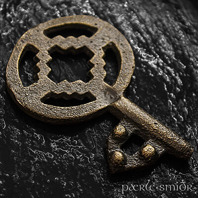 Replik eines grob gearbeiteten Schlüssels der Wikingerzeit aus massiver Bronze. Schlüssel dieser Art wurden für die Schlösser an Türen und Truhen verwendet.