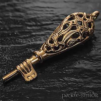 Replik eines wikingerzeitlichen Schlüssels in Bronze. Den ovalen, konischen Griff schmücken Tier-Ornamente im Borre-Stil.