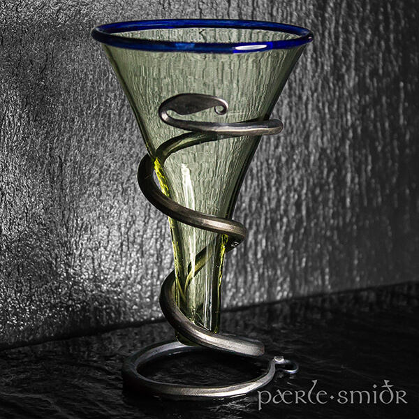 Handgefertigte Replik eines Trichterbechers in verkleinerter Form. Der Trichterbecher ist aus leicht grünlicher Glasmasse hergestellt und hat einen aufgelegten blauen Mündungsrand. Zum Lieferumfang gehört ein handgeschmiedeter Metall-Ständer, der sich wie die Midgard-Schlange um das Glas windet. Volumen ca. 0,05 Liter